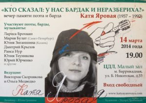 14 марта 2014 года в 19.00 в Малом зале Центрального дома литераторов состоится вечер памяти Кати Яровой “Кто сказал: у нас бардак и неразбериха?”