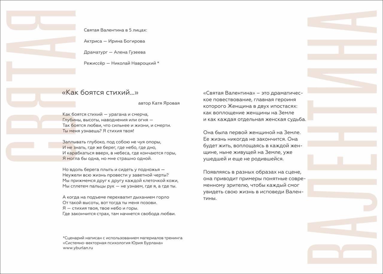 Как правило, накануне Катиных памятных дат (12 декабря и 15 апреля) начинает что-то происходить, связанное с ее именем. Вот и сейчас, в преддверии 30-летия со дня ухода Кати, в Новосибирске, городе, где закончился ее земной путь, в Театре Арт-Усадьба с успехом прошла премьера спектакля «Святая Валентина», в котором звучит стихотворение Кати «Как боятся стихий…» На память зрителям осталась программка с полным текстом стихотворения. Благодарим драматурга Алену Гузееву за идею использовать в пьесе стихи Кати Яровой, а также режиссера Николая Навроцкого и актрису Ирину Богирову. Желаем дальнейших успехов спектаклю и всей творческой группе!