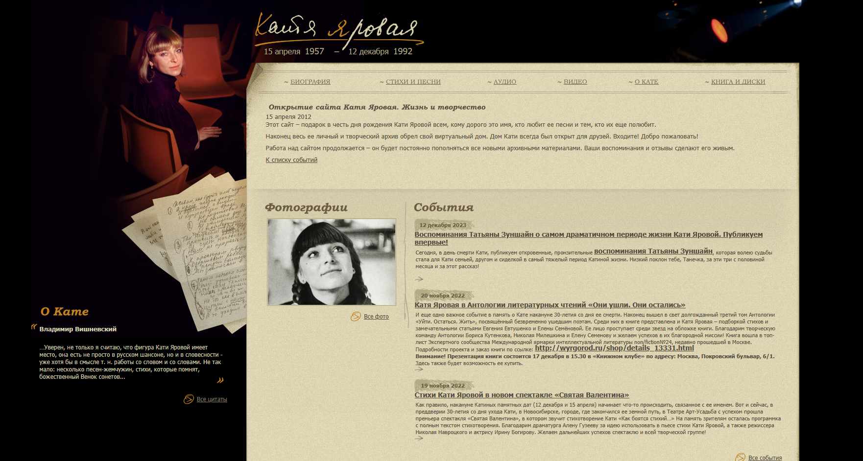 Этот сайт – подарок в честь дня рождения Кати Яровой всем, кому дорого это имя, кто любит ее песни и тем, кто их еще полюбит. Наконец весь ее личный и творческий архив обрел свой виртуальный дом. Дом Кати всегда был открыт для друзей. Входите! Добро пожаловать! Работа над сайтом продолжается – он будет постоянно пополняться все новыми архивными материалами. Ваши воспоминания и отзывы сделают его живым.